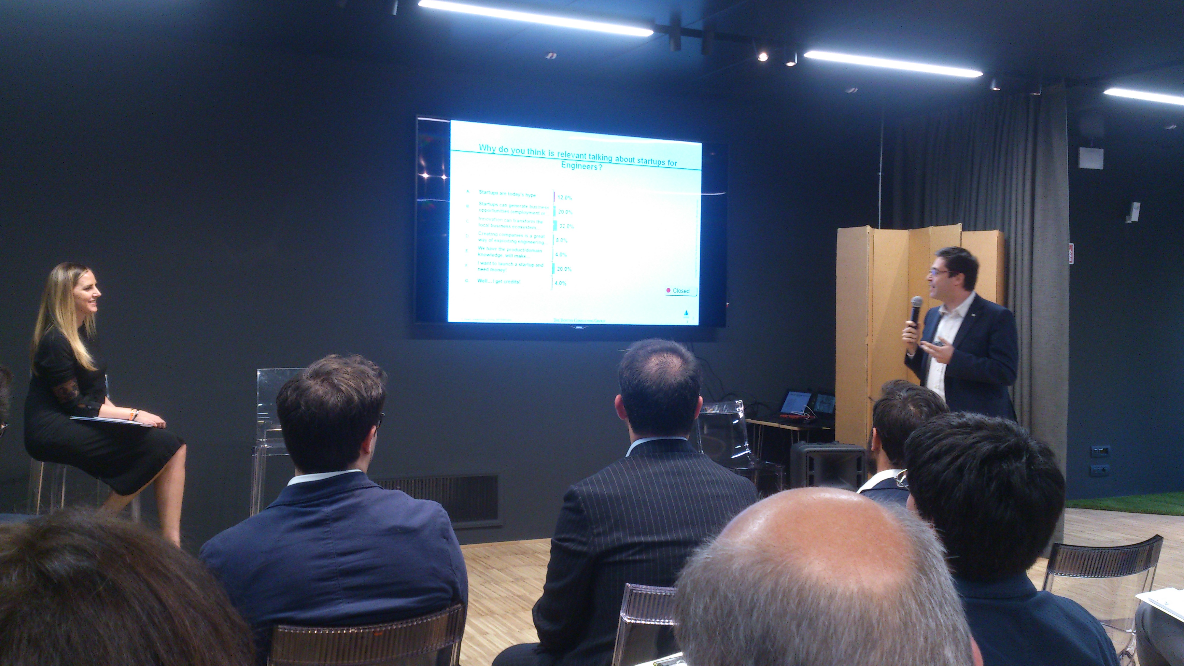 La serata ha avuto come focus la definizione di Start Up ed alcuni esempi prestigiosi di successo raccontati direttamente dai relativi protagonisti. In particolare, la prima parte della serata è stata caratterizzata da piccoli interventi da parte di esperti manageriali e di finanza su argomenti come incubatori, acceleratori e fund raising; la seconda parte, invece, ha avuto come attori principali ragazzi – non più grandi di me – che hanno raccontato la loro esperienza aziendale e i loro prodotti innovativi.