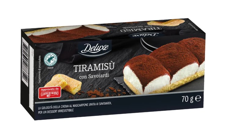 Il Deluxe Tiramisù con Savoiardi è venduto da Lidl a 1,09 € per confezione da 70 g, il che equivale a circa 15,57 € al chilo. Fa parte della linea di prodotti premium del marchio e porta con sé alcune certificazioni interessanti, come quella della Rainforest Alliance – Persone & Natura e l’approvazione del Gambero Rosso, che ne conferiscono una certa credibilità in termini di qualità e sostenibilità.